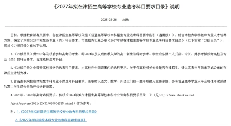 市高招办汇总公布《2027年拟在津招生高等学校专业选考科目要求目录》(可查阅天津市教育招生考试院官方网站),供2027年及以后参加高考的考生,即2024年秋季及之后入学的高一新生选科时参考。