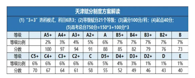 普通高中学业水平等级性考试成绩在计入高校招生录取总成绩时,每门科目成绩由五等细化为21级。相邻两级之间的分差均为3分,前2%均为满分100分,后1%均为40分。