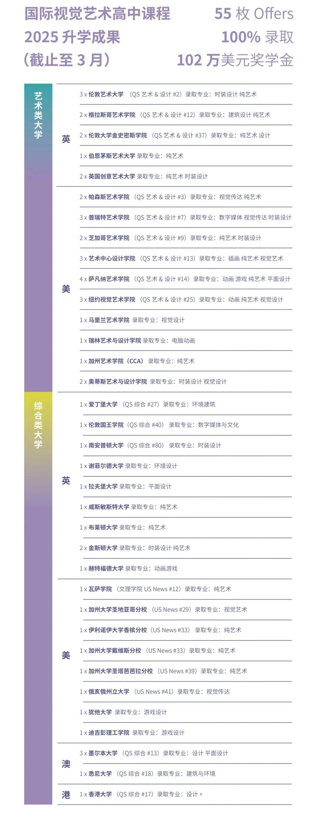 通过构建多元化课程体系与个性化教育规划,学校多维度培养学生的艺术思维,助力其发掘独特艺术表达视角,强化核心竞争力。以国际学府录取标准为导向,为学生量身定制升学路径,帮助他们叩响世界艺术与设计院校之门,着力培养兼具全球化视野、跨文化沟通能力与跨领域创新胜任力的复合型艺术人才。