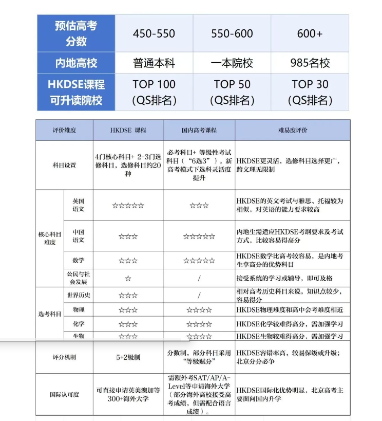 HKDSE考试整体难度低于内地高考,容易取得高分,无论大学录取率或申请牛校的机会,都有优势。目前进入“香港三大”(香港大学、香港中文大学和香港科技大学)的最低HKDSE分数大概5科总成绩在23至28分左右。