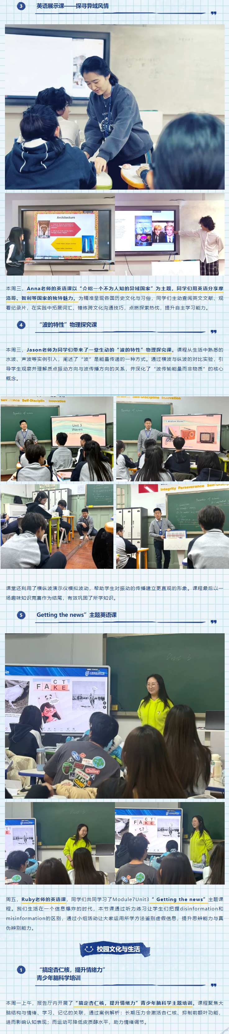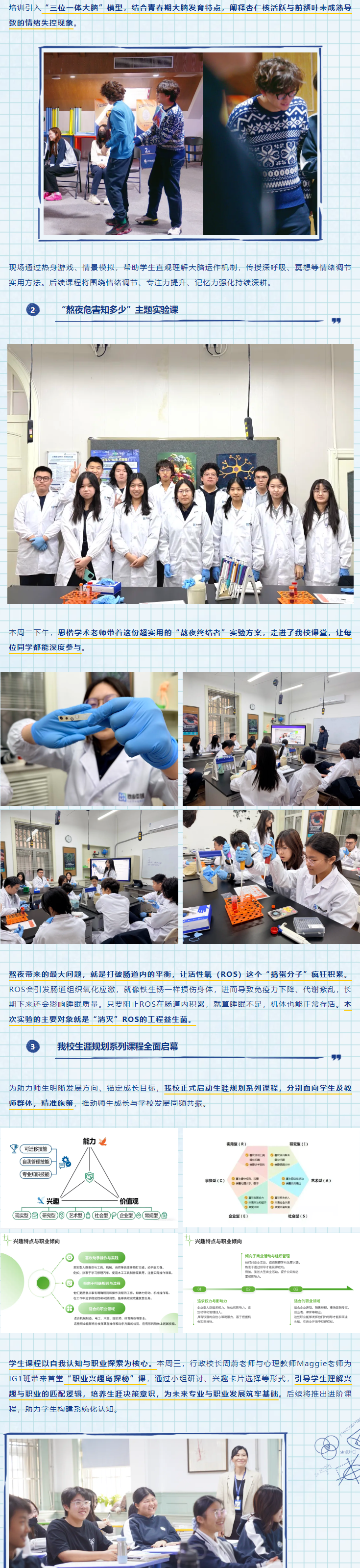 冬韵渐浓,校园焕彩!2枚墨尔本大学Offer为冬日添辉,执行校长高越老师参与“构建AI赋能下的创新人才培养新生态”教育交流活动并向学科组长传达会议精神,彰显育人探索初心;化学、物理、英语课堂深耕探究,青少年脑科学培训、思楷实验室主题实验课解锁健康新知,生涯规划系列课程全面启幕,社团活力迸发,“教育管理与领导力顾问聘任仪式”圆满落幕。学术探索、对外交流、成长赋能、合作共赢的多元篇章,在冬日校园徐徐展开,让我们走进本周Newsletter,重温每一份收获与热忱!