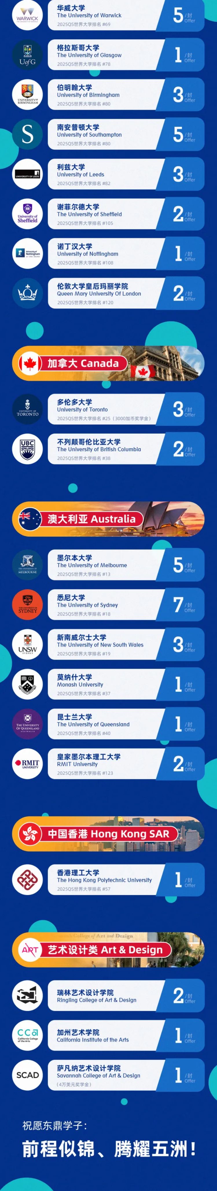 时光荏苒,又一年的毕业季如期而至。截止2024年6月5日上海浦东新区民办东鼎外国语学校国际高中部2024届毕业生们,共斩获81封来自全球学府的Offer。本届毕业生申请综合类大学的同学收到了2025QS世界排名前35名校的Offer。其中英国综合类大学G5率超过40%。