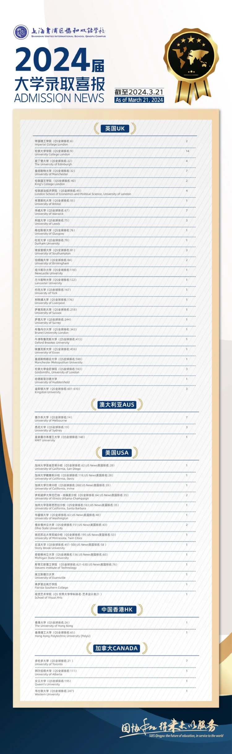 截至2024年6月14日,青浦协和高中2024届毕业生目前共斩获134枚来自英国、美国、澳大利亚、中国香港、加拿大、新加坡等国家和地区大学的录取。其中有近40%的学生斩获了英国G5超级精英大学的预录取,50%的学生斩获了QS世界前30大学的(预)录取,75%的学生斩获了QS世界前100大学的(预)录取