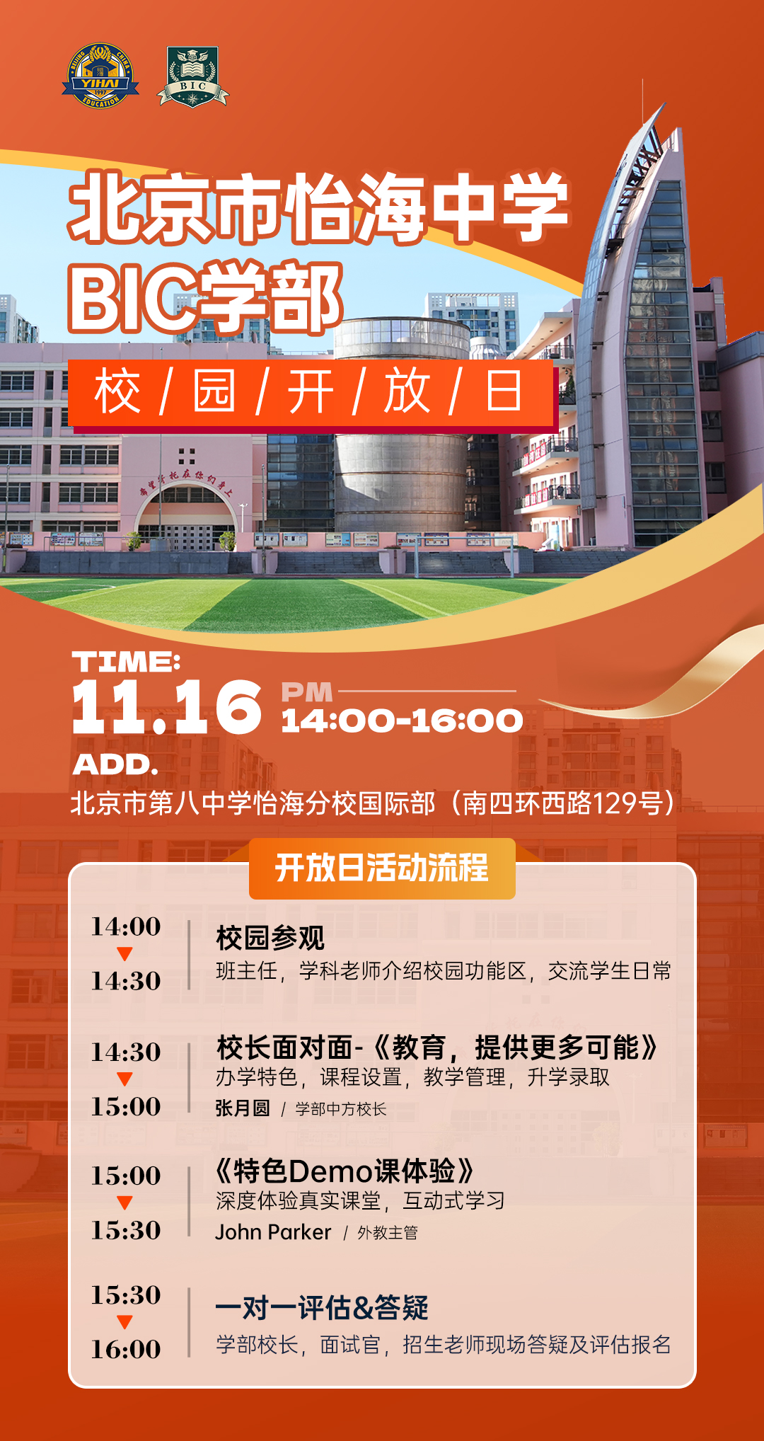 亲爱的家长们,北京市怡海中学BIC学部校园开放日将于11 月 16 日 14:00-16:00举办,诚邀您与孩子一同走进校园,全方位感受国际教育特色与办学优势。