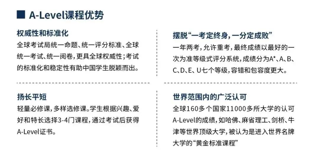 A-Level课程(General Certificate of Education Advanced Level), 是英国普通中等教育证书考试高级水平课程,也是英国学生的大学入学考试课程,由剑桥大学考试委员会统一命题,被称为“申请世界一流大学的金牌考试”, 被160多个国家与地区,11000多所大学认可。