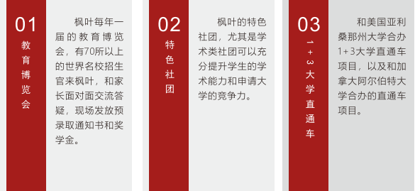 【全英班】如果中考的英语成绩达到102分(或者英语满分的85%),或者是参加枫叶的能力测试达到了85%以上的标准,并通过外方校长的面试,可以录取全英班。