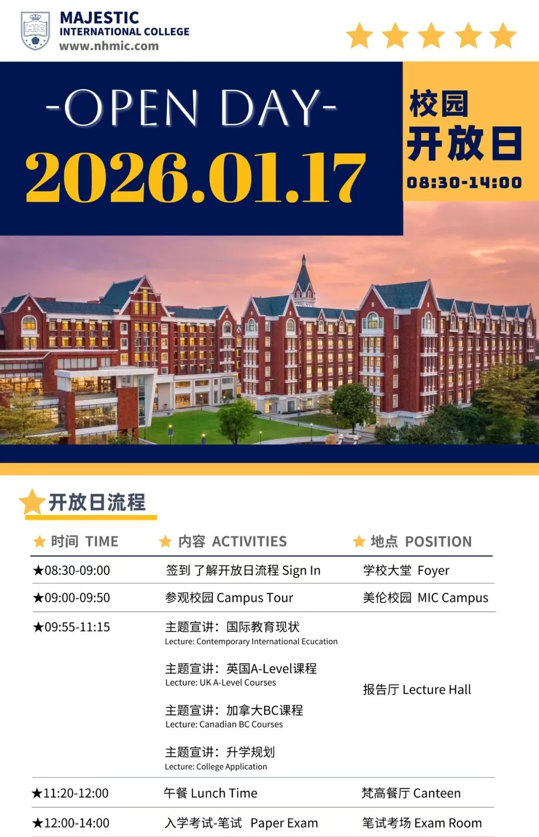 为了让家长和学生更好地了解学校,佛山美伦国际高中将举办新年首场校园开放日活动。活动时间为 1 月 17 日 8:30 - 14:00.届时将有校园参观和入学评估环节。家长和学生可以亲身感受美伦的校园氛围,了解学校的师资、理念与特色,以及什么样的孩子适合来美伦学习。