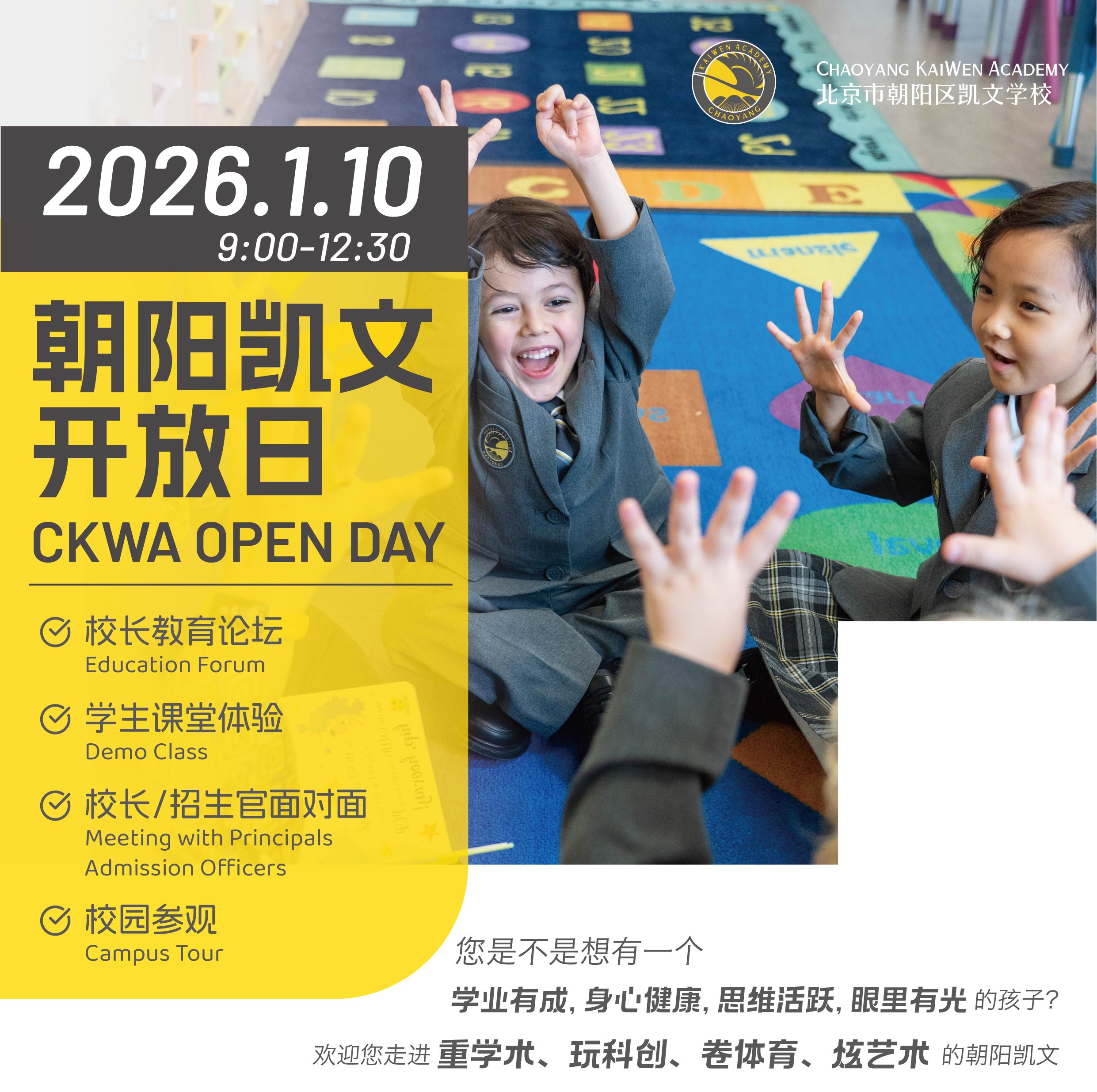 亲爱的家长们,北京市朝阳区凯文学校(CKWA)开放日将于2026 年 1 月 10 日 9:00-12:30举办,诚邀您走进校园,感受 “重学术、玩科创、卷体育、炫艺术” 的教育氛围。