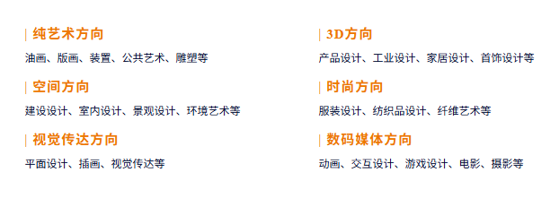·设有纯艺术方向、3D方向、空间方向、时尚方向、视觉传达方向、数码媒体方向