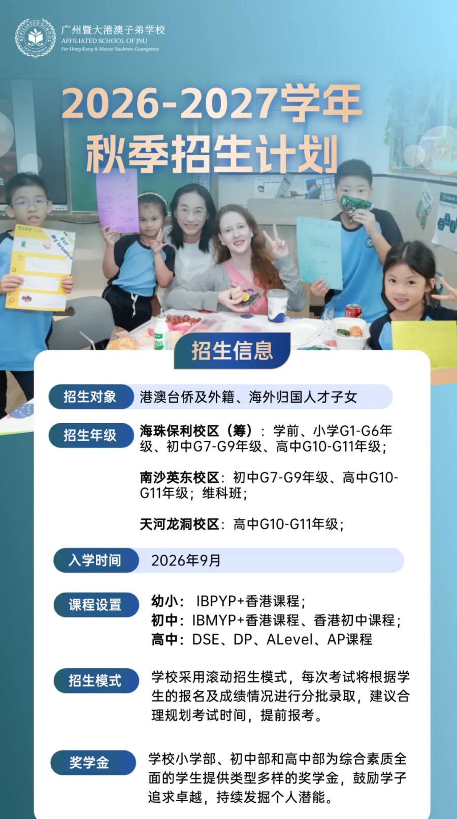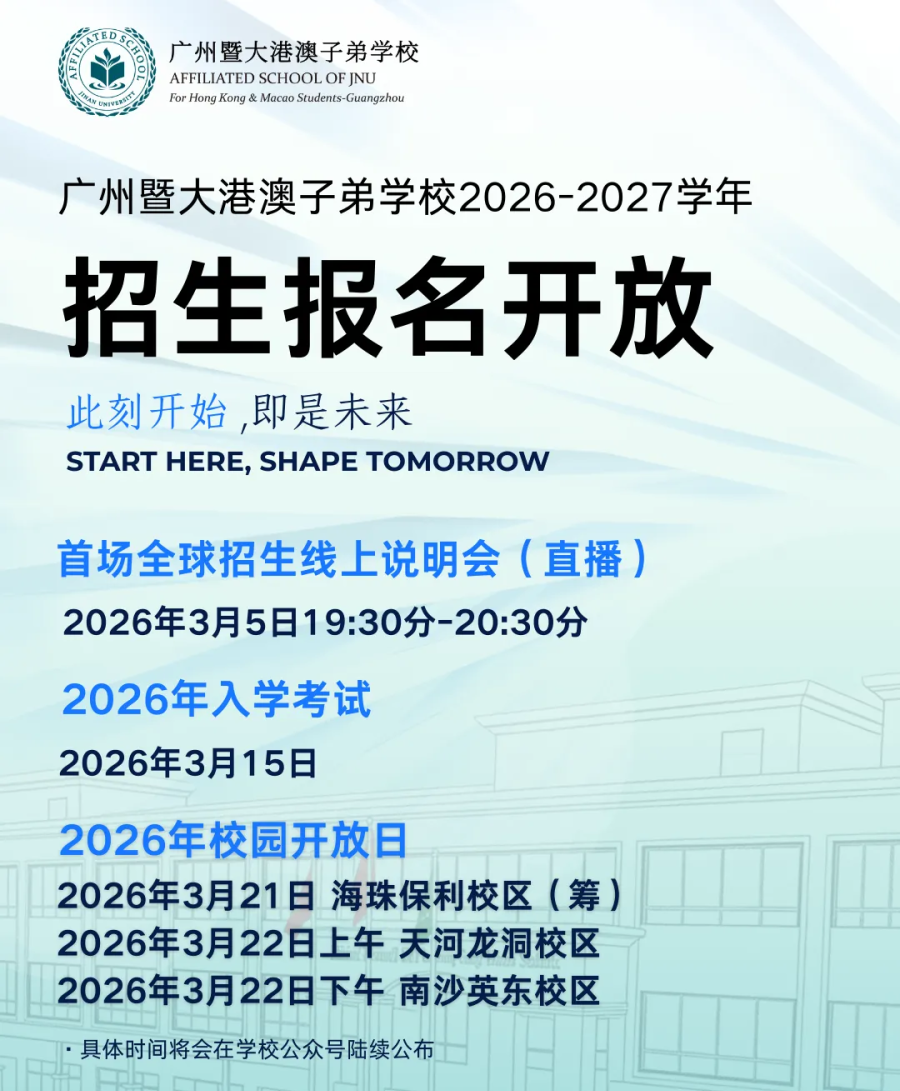 广州暨大港澳子弟学校位于广州市,目前拥有天河龙洞、南沙英东以及海珠保利(筹)三个校区,是一所涵盖学前至高中阶段的15年一贯制学校。