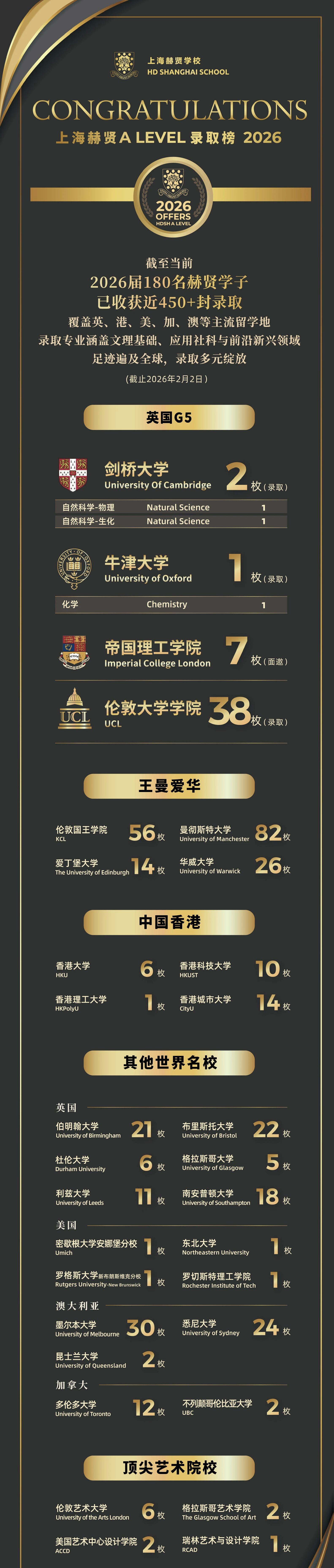 毕业生屡获世界高校录取,录取涵盖英、美、中国香港、加、澳等全球多国别与地区,录取成绩连年稳步上涨。