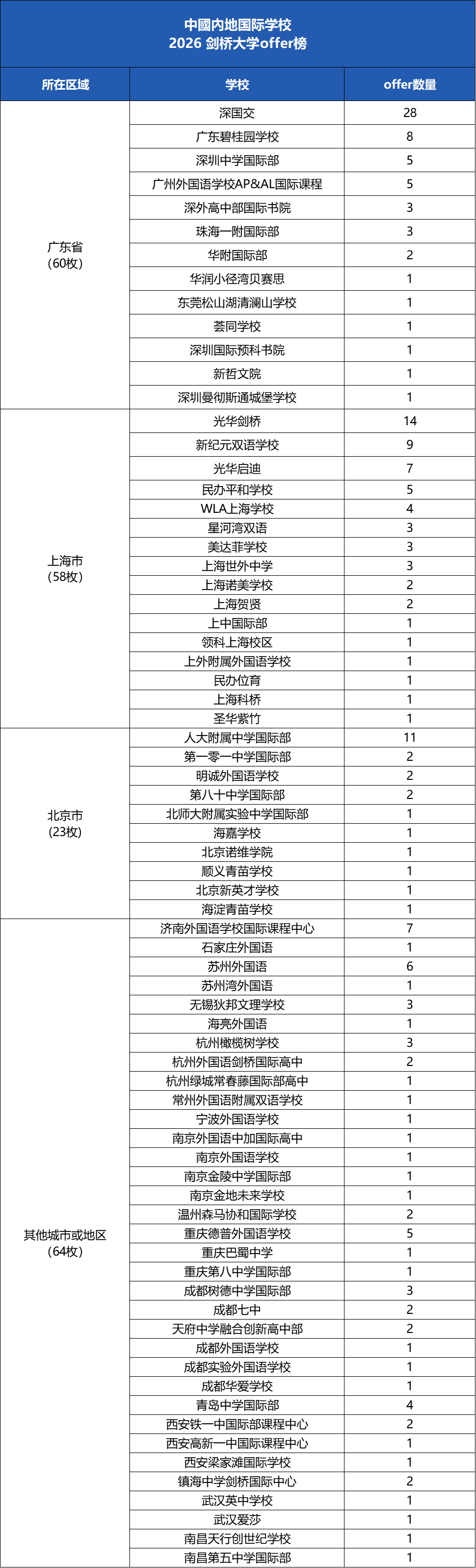 从表中可以看到,今年剑桥offer,广东省内offer数量略微领先上海,其中offer数最多的学校前五名为: