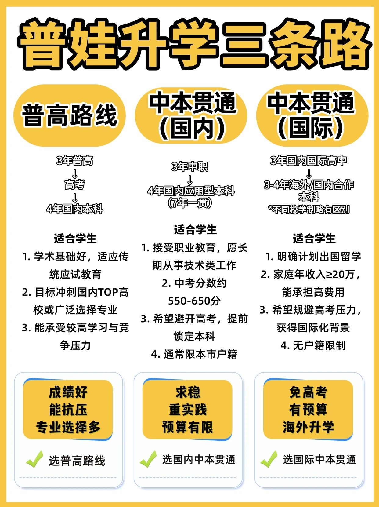 · 路径:传统升学路径,高中3年,最后高考一锤定音