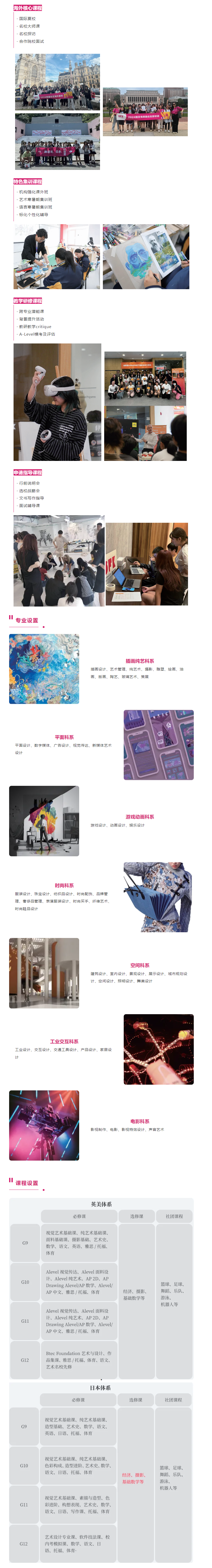 05教学体系:凭借13年艺术教学及升学经验,结合国际课程教学体系,学校设置专业基础课、技法提升课、专业项目课、海外教授辅导课、原创工坊课、牛校先修课等多维度课程,培养学生艺术设计能力。课程类型丰富多样,包括海外核心课程(国际夏校、牛校大师课、牛校探访、合作院校面试)、特色集训课程(机构强化课外班、艺术寒暑期集训班、语言寒暑期集训班、标化个性化辅导)、教学研修课程(跨专业潜能课、背景提升活动、教研教学critique、A - Level模考及评估)、申请指导课程(行前说明会、选校战略会、文书写作指导、面试辅导课)。