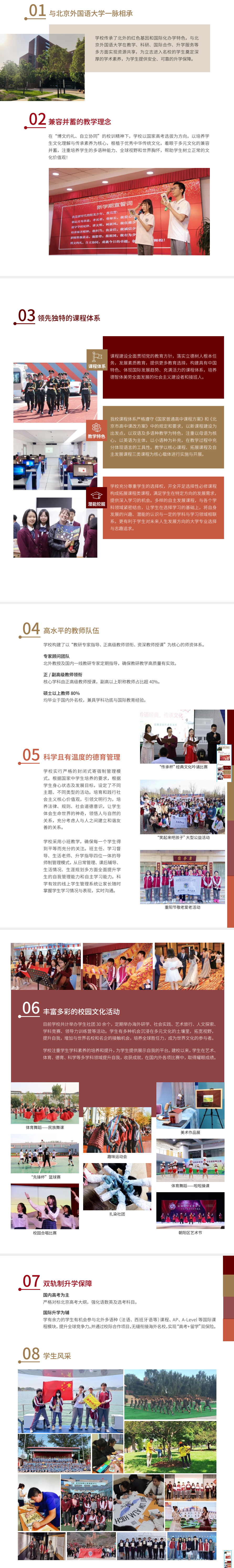 学校依托北京外国语大学优质教育资源,传承百年外语教育底蕴,发扬北外“服务国家、服务社会”的办学传统,致力于培养兼具家国情怀与国际视野的复合型人才。学校开设普高班与国际班,普高班以国内高考为核心,国际班以全球升学为目标,为学生提供多元化升学路径。目前有朝阳区金盏校区、海淀区北外校区同步运营,共计在校生750人。