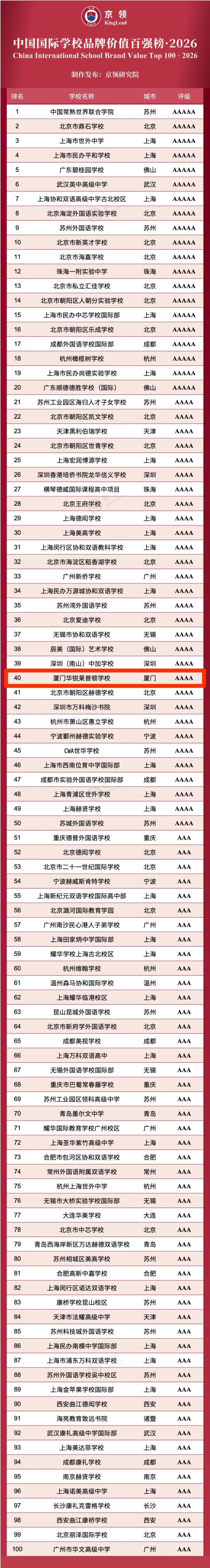 2026京领中国国际学校品牌价值百强榜