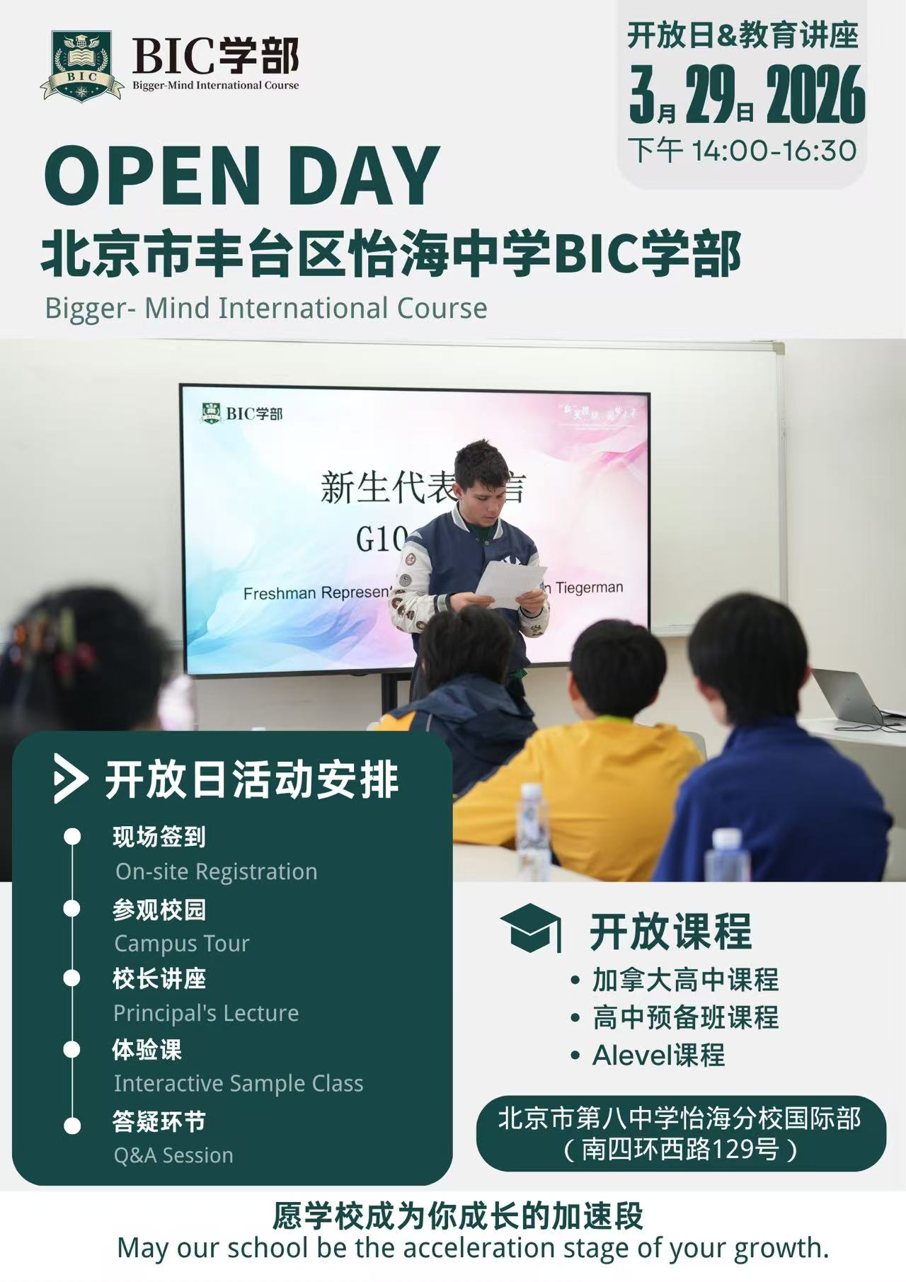 活动时间为 2026 年 3 月 29 日 14:00-16:30.地点为北京市第八中学怡海分校国际部,建议提前规划出行时间,准时到场。