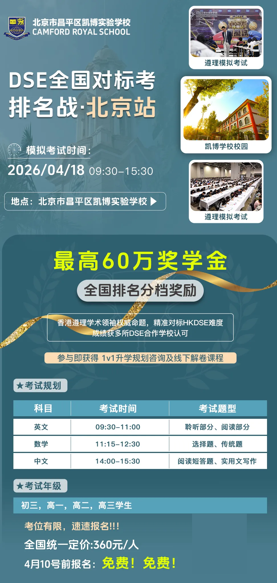 本次北京站对标考为北方地区DSE学子专属福利,考位有限,先到先得!参与考试即可享受权威测评、全国对标、教师指导、奖学金角逐、多校入学推荐等多重机会。高一至高三DSE考生,切勿错过这次在家门口就能冲刺60万奖学金、链接全国优质教育资源的稀缺契机!即刻报名,抢占北京站稀缺考位,向60万奖学金发起冲击,用一次全国对标考,定义DSE升学新高度!