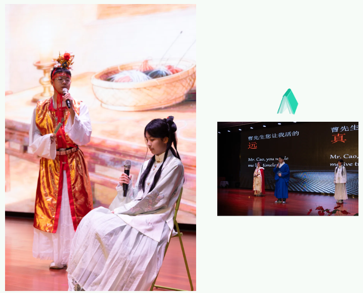 10年级1、2班带来的剧目《红楼双钗问曹公》,以独特视角重构古典经典。“灵巧叛逆,傲骨铮铮”的晴雯、“才自精明,志自高”的探春被演员们精准诠释,两位经典女性角色跨越时空与 “曹公” 展开灵魂对话。