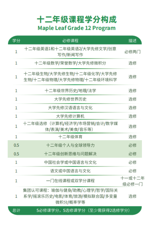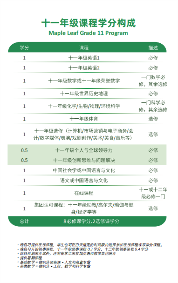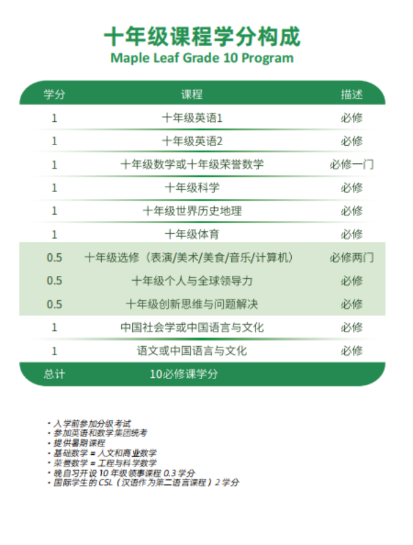 学生每学年学习10门枫叶世界学校课程,学习合格后取得相应学分。枫叶世界学校课程高中毕业要求: