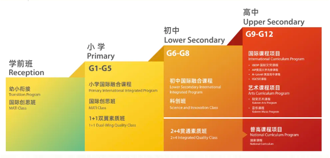 朝阳凯文的课程体系以系统丰富见长,是一条从小学学前到高中、从基础知识到学术探究的完整学习曲线: