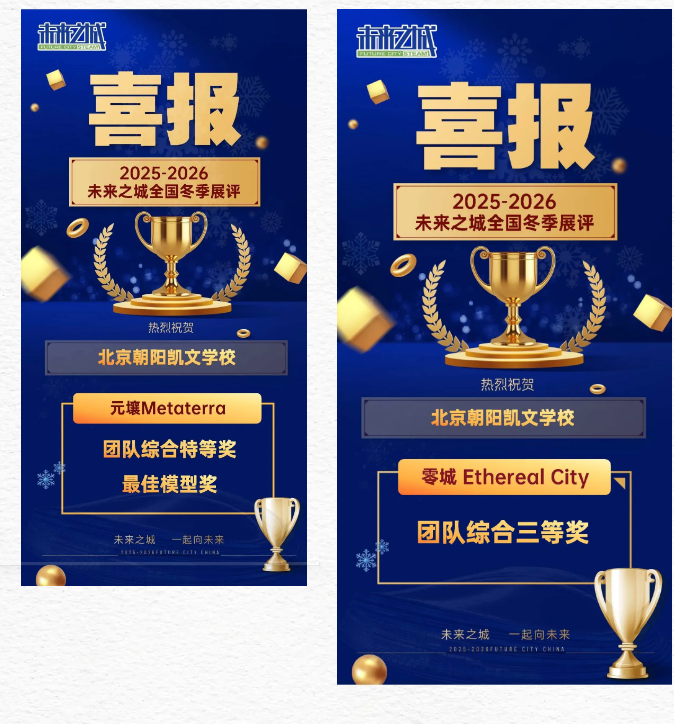 在2025-2026未来城市中国总决赛中,北京朝阳凯文学校的两支参赛队在全国百余所参赛学校中脱颖而出,荣获团队综合特等奖、最佳模型奖和三等奖!