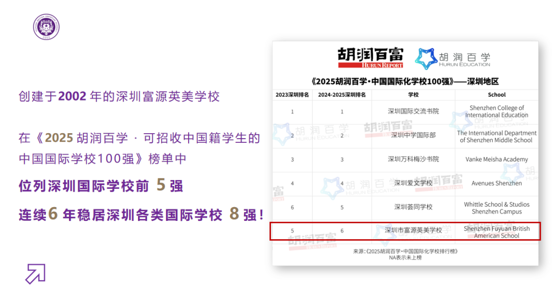 胡润百学作为胡润百富旗下国际教育平台,其年度榜单是中国国际化教育领域最具权威性与参考价值的评价体系之一。榜单从教育成果、师资力量、课程体系、校园设施、品牌口碑等多个维度进行综合评估,旨在为中国家庭提供理性、客观的择校参考。在2025年最新榜单中,深圳富源英美学校不仅稳居深圳地区前5强,更连续6年保持深圳各类国际学校8强的优异成绩。这既是对学校办学成果的高度认可,也是对全体师生与家长长期支持的最 好回报。