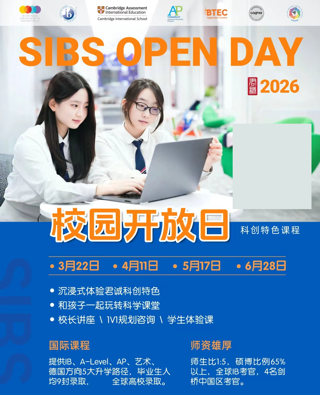 亲爱的家长们,SIBS 君诚校园开放日系列活动即将开启,多场活动诚邀您与孩子一同走进校园,沉浸式感受科创特色教育的魅力。
