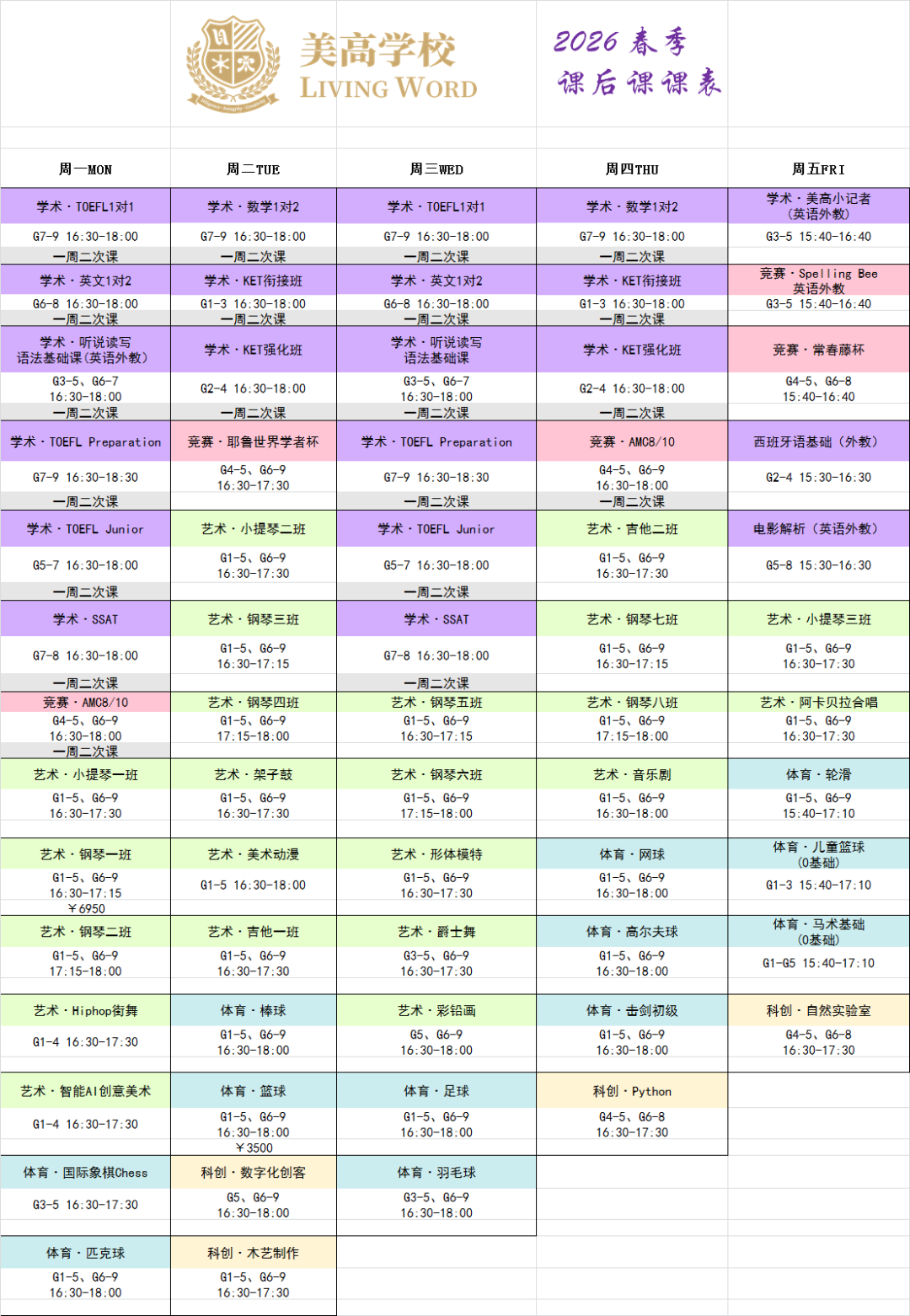 上海美高双语学校向各位美高同学和家长宣布,2026 年春季课后兴趣班报名正式启动。该兴趣班涵盖美高特色课程、领导者养成计划、科技与艺术等多元领域,秉持“真运动、真学术、真有趣”的理念,为同学们提供了丰富的课程选择。