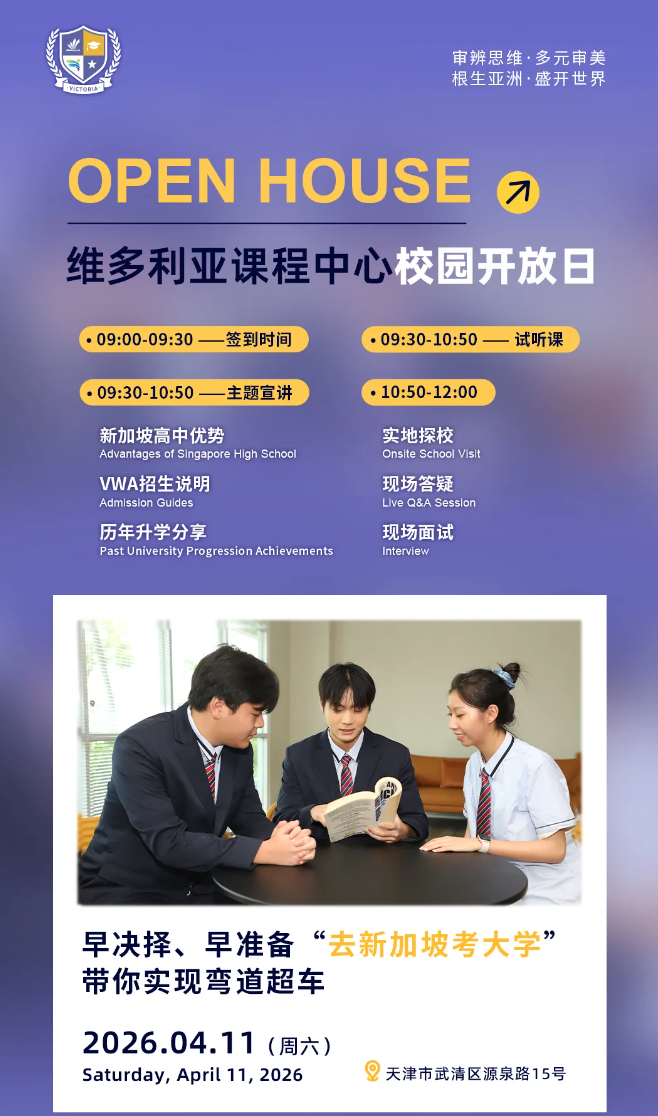 4月11日,维多利亚A - Level课程中心将举办校园开放日,届时将为您详细剖析新加坡升学路径的全貌与优势。开放日当天,您可与孩子一同参观校园环境、参与课程宣讲与试听,并与升学规划导师面对面交流,获取最真实、最直接的体验。您可预约访校名额,在此之前,可通过以下内容预先了解学校详情。