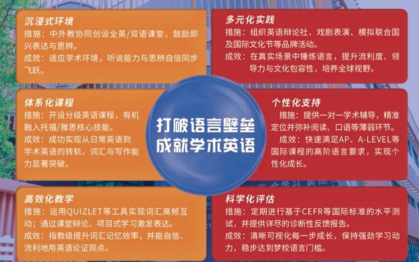 项目通过全英/双语课堂、分级英语课程、托福/雅思技能融入等方式,帮助学生快速突破语言关。
