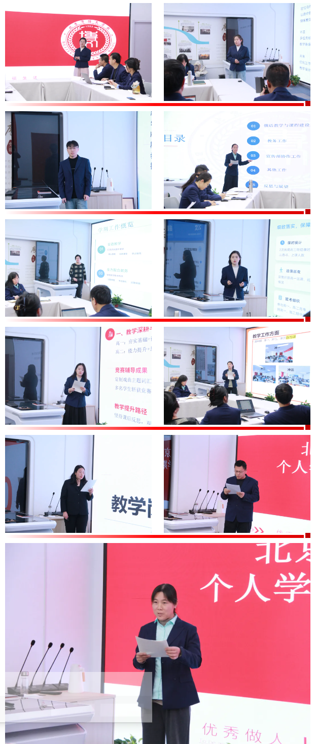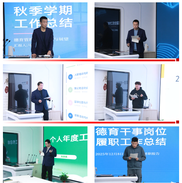 述职环节中,教学组11位教师与德育组6位教师依次登台,结合自身岗位职责与工作实际,全面复盘学期工作亮点,深刻剖析存在不足,清晰规划未来方向,展现出博文教师求真务实、锐意进取的良好风貌。