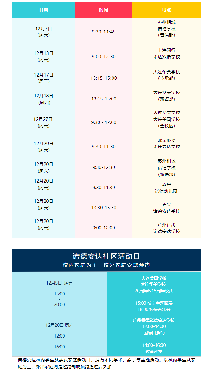 小助理每月第一篇将发布诺德安达各校开放日时间及主题活动,方便希望深入了解本地诺校的家长与学生提前规划探校行程。如有疑问,可在后台咨询。