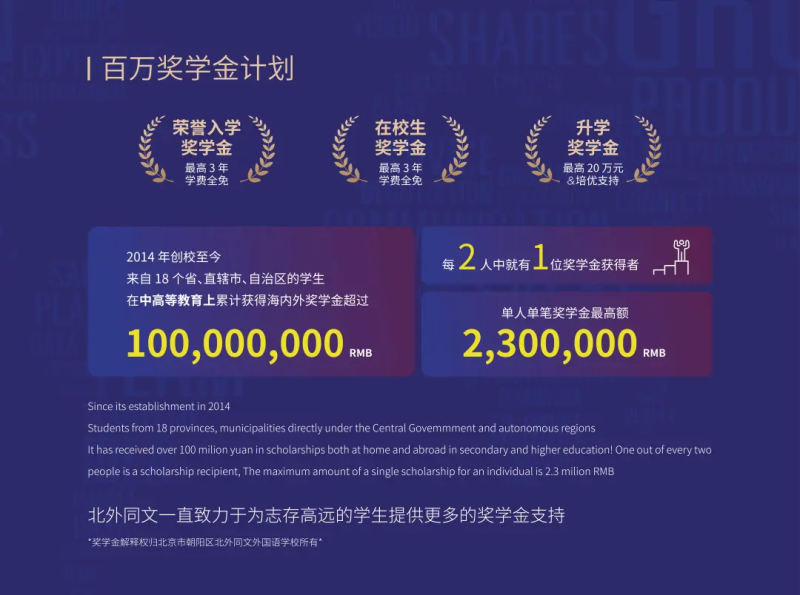 北外同文始终致力于为志存高远的学子提供有力支持,特设百万奖学金体系,涵盖荣誉入学奖学金、在校生奖学金、升学奖学金三大类别,全面激励在学术能力与综合素质上表现优异的学生,让每一份努力与卓越都能得到认可和嘉奖。