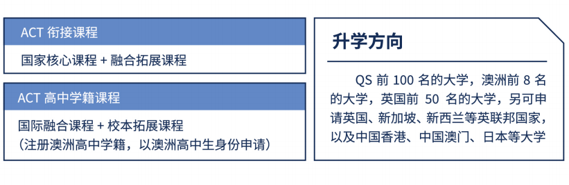 学生入学即可注册澳洲ACT官方高中学籍,毕业后拥有澳洲堪培拉教育部认证的学籍学历证明。升入英、美、澳、加、港、新等高校,无需雅思、无需高考。