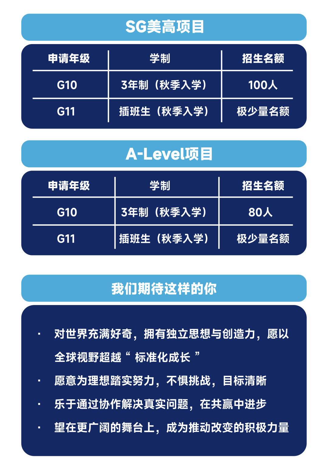 2. 参加开放日和学术测评:9年级升10年级需参加数学和英语笔试,考纲和相关说明如下。10年级及以上学段插 班生,请通过邮件、微信或电话联系招生办公室咨询测评要求。每学期,学校将为部分海外及外省市学生提供至少一次线上学术测评的机会,具体时间由学校统一安排。海外或路程较远的外省市学生,请提前联系招生办公室。