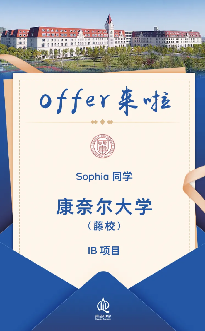 当康奈尔大学的橄榄枝乘着春风翩然而至,2025-2026申请季的藤校版图上再添一座学校:继ED阶段收获达特茅斯录取后,RD阶段IB项目的Sophia同学成功斩获康奈尔大学的offer。两所藤校的同步认可,不仅印证了青岛中学多平台、多元化的培养路径,更充分展现了学子扎实的综合素养与学术实力。每一份邀约背后,都是对教育初心的回响。