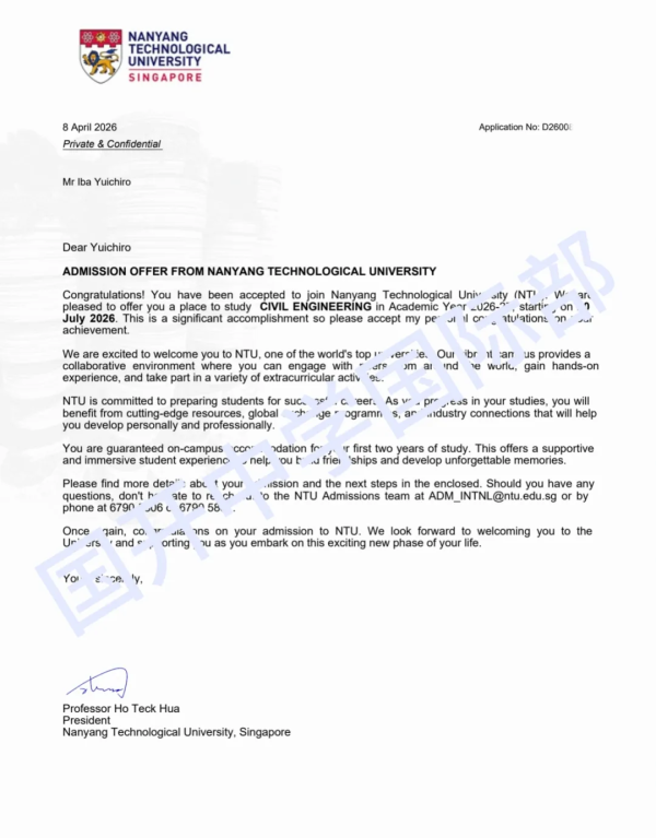 新加坡南洋理工大学(NTU),作为全球综合性大学,2026年QS世界大学排名第12位,亚洲第3!能够在万千竞争者中脱颖而出,斩获这所世界学府热门专业的录取,足以彰显射场雄一郎同学的卓越实力与不懈追求!