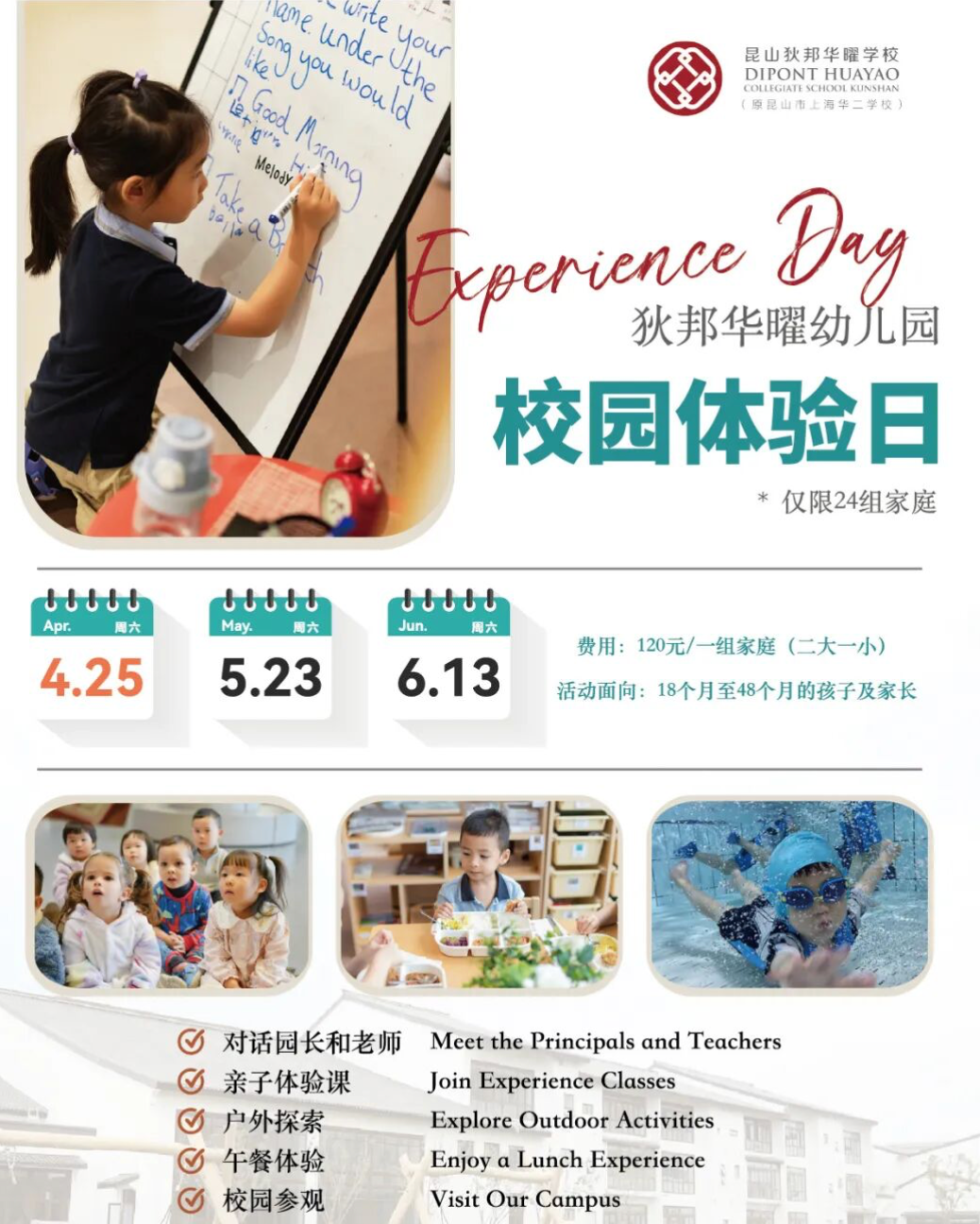 昆山狄邦华曜学校幼儿园将于4月25日(周六)9:30 - 12:30举办课程体验日活动,诚邀18个月至48个月孩子的家庭参与。