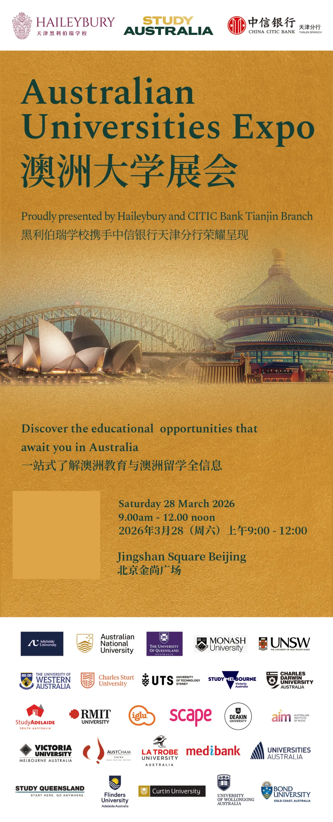 黑利伯瑞国际学校始终致力于为学生架设通往全球优质教育资源的桥梁。2026年3月,该校将荣幸主办2026年澳大利亚大学展,此次活动得到澳大利亚贸易投资委员会(StudyAustralia)、澳大利亚驻华大使馆及澳大利亚商会北京分会的大力支持。