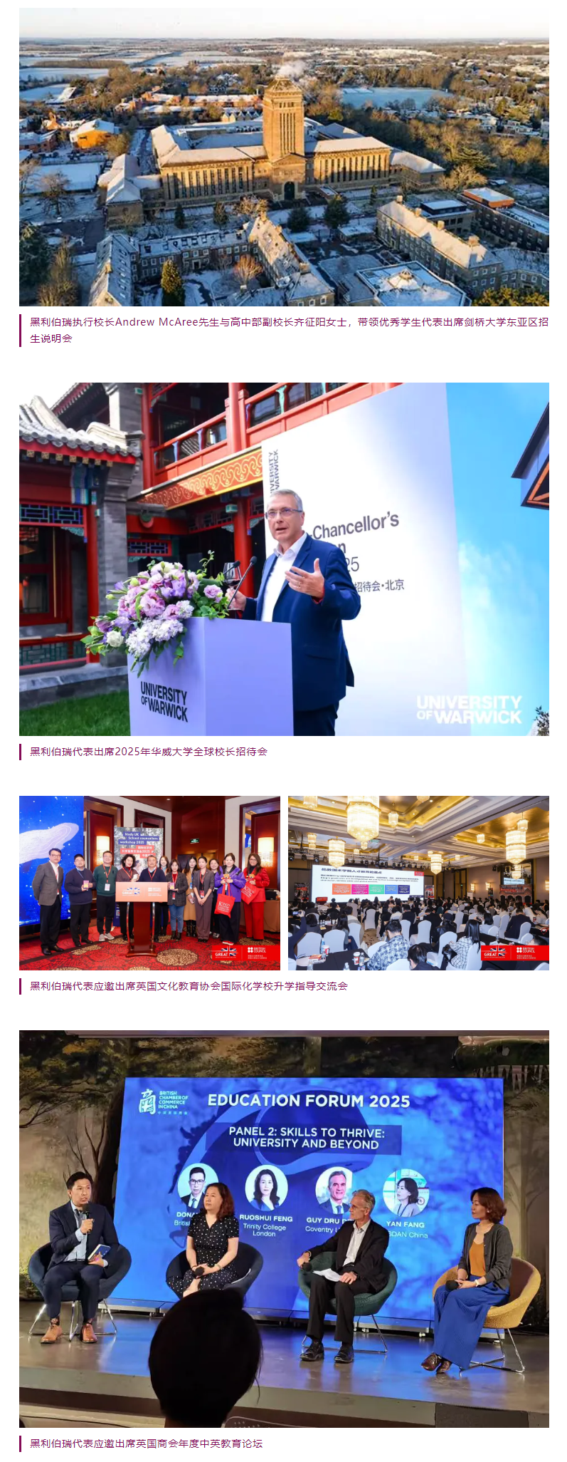 黑利伯瑞国际学校执行校长Andrew McAree先生与高中部副校长齐征阳女士,曾带领优秀学生代表出席剑桥大学东亚区招生说明会。学校代表还出席了2025年华威大学全球校长招待会、英国文化教育协会国际化学校升学指导交流会以及英国商会年度中英教育论坛。