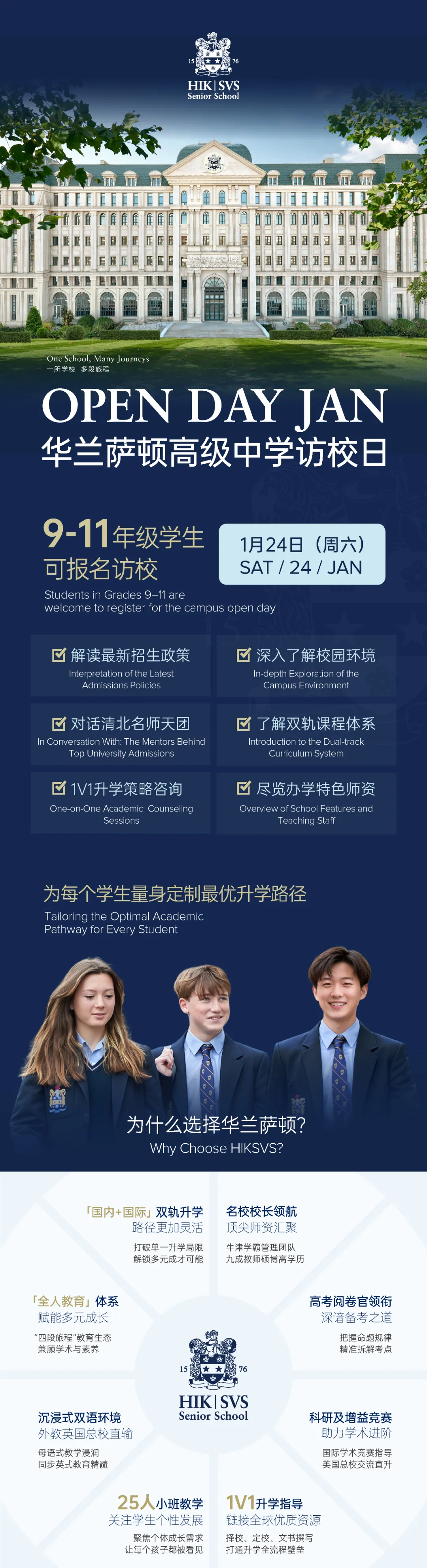 为帮助学生及家长深入了解学校办学特色与课程体系,华兰萨顿高级中学将于1 月 24 日(周六) 举办访校日活动,面向 9-11 年级学生开放报名。