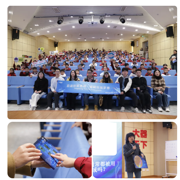 课堂上芯片的概念、作用、制造过程不再抽象,电脑主板模型的讲解让知识变得触手可及。实践环节最是热闹,在英特尔志愿者和老师的指导下,同学们围坐在一起尝试芯片设计趣味项目,大胆提问、动手拼接,指尖的创造与眼中的好奇碰撞,每一个专注的瞬间,都藏着科技种子生根发芽的力量。