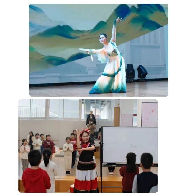 古典舞《醉清波》的丝竹声里,她以轻盈舞姿勾勒出江南的温婉,“醉中见真、清中藏情”的意境让评委动容;执教课例《彝家娃娃真幸福》中,她又带着孩子们借月琴与口弦,感受彝族文化的鲜活生命力。
