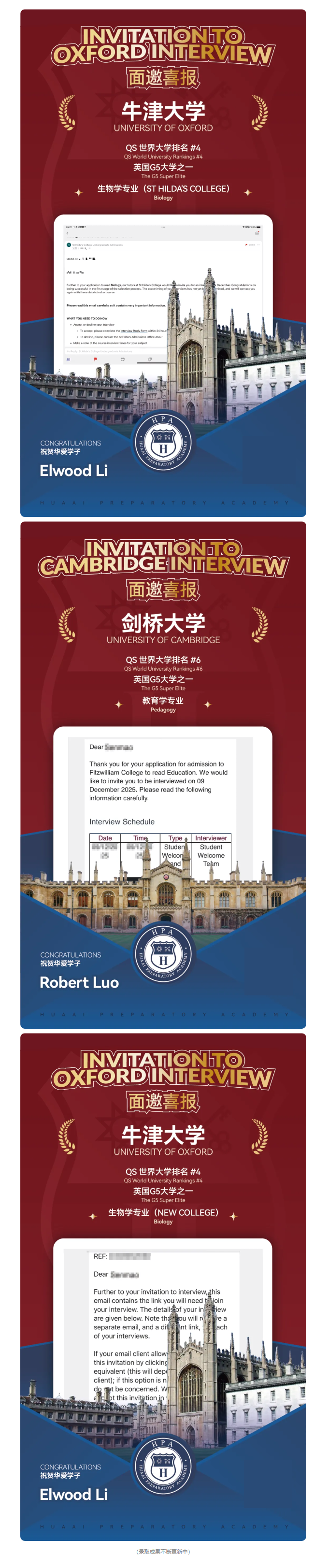 历史突破!华爱2026届毕业生已收获3份牛剑面邀,其中牛津大学New College生物学专业1份,牛津大学St. Hildas College生物学专业1份,剑桥大学教育学专业1份。
