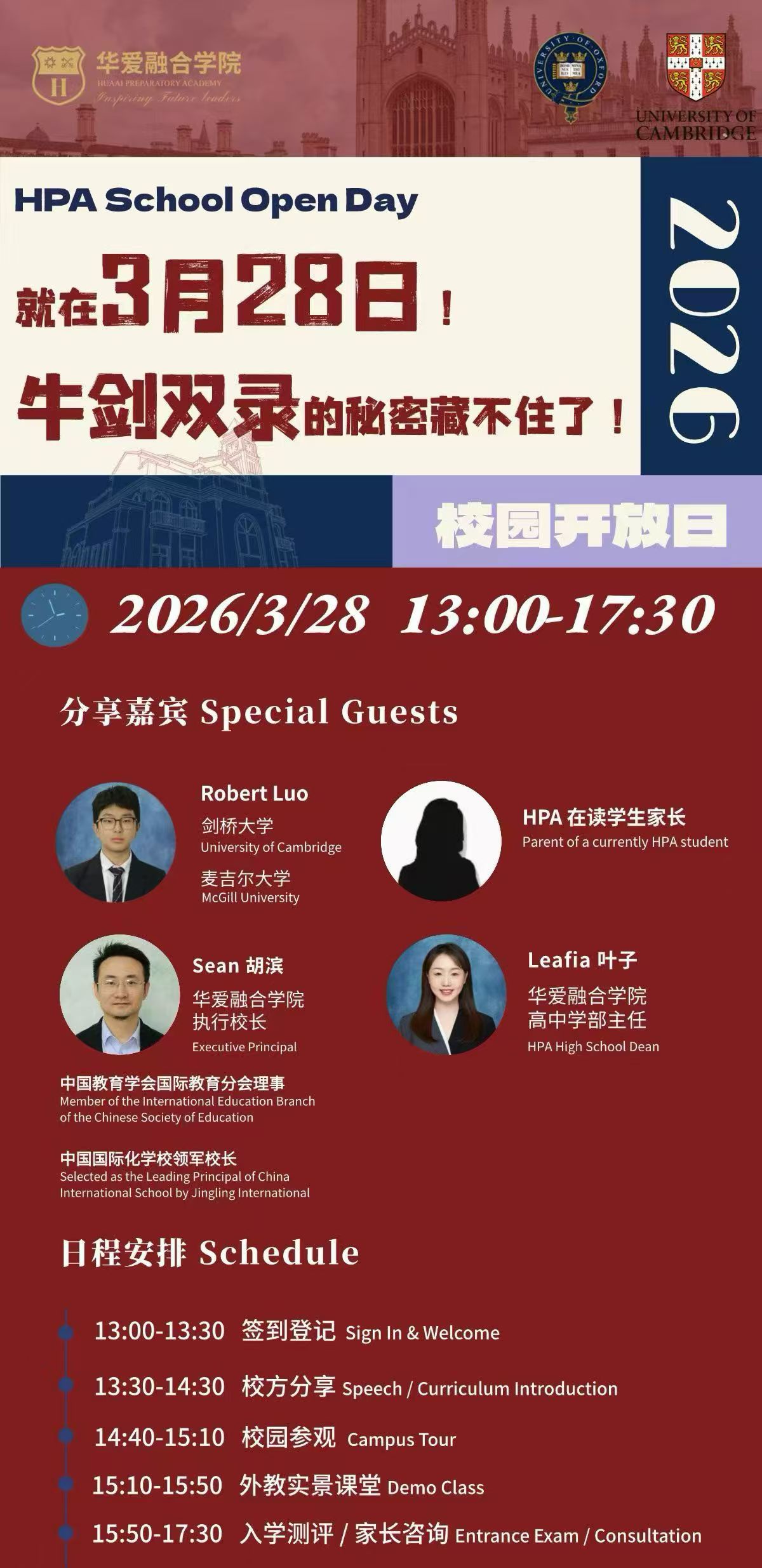 华爱融合学院(HPA)将于2026 年 3 月 28 日 13:00-17:30举办校园开放日活动,活动以 “牛剑双录的秘密” 为主题,邀请学生及家长走进校园,了解学校办学特色与育人路径。