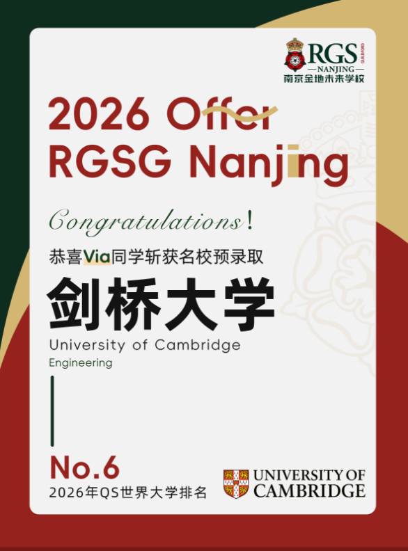 昨晚,南京金地未来学校(RGSG)传来振奋人心的捷报——Via同学成功斩获剑桥大学工程专业正式offer。