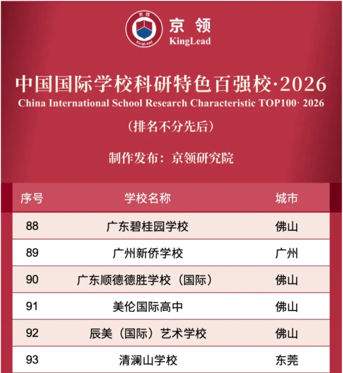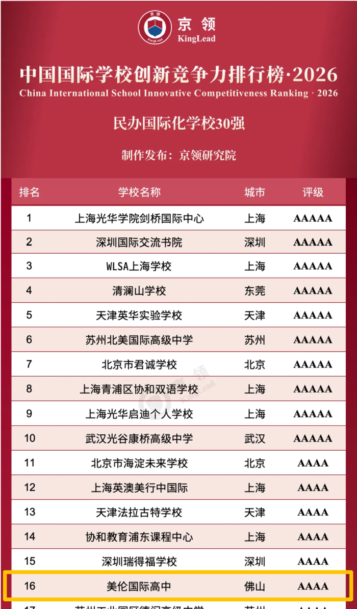 在《2026中国国际学校创新竞争力排行榜》中,美伦凭借卓越的创新教育实力与可持续办学能力,获评4A级创新名 校,成功跻身全国TOP 16,成为华南地区少数入选TOP20的国际化牛校之一。评审团高度肯定了学校在课程融合、教学模式及人才培养方面的创新实践,认为这些举措为学生的未来发展奠定了坚实基础。