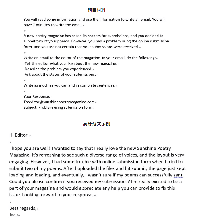 题目要求的三项核心任务在范文中均得到了精准回应。邮件开头明确表达了对杂志的喜爱(what you like);第二段清晰说明了投稿时遇到的技术故障(describe the problem);最后作者直接请求编辑确认是否收到稿件(ask about the status)。范文没有遗漏任何任务点,这是高效回应的基础。