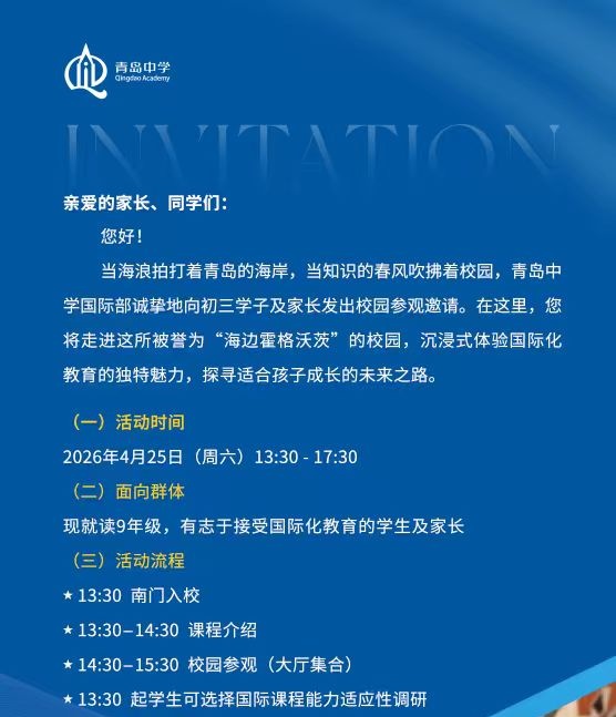 招生|青岛中学2026年秋季学期1-10年级(国内、国际方向)有空余学位